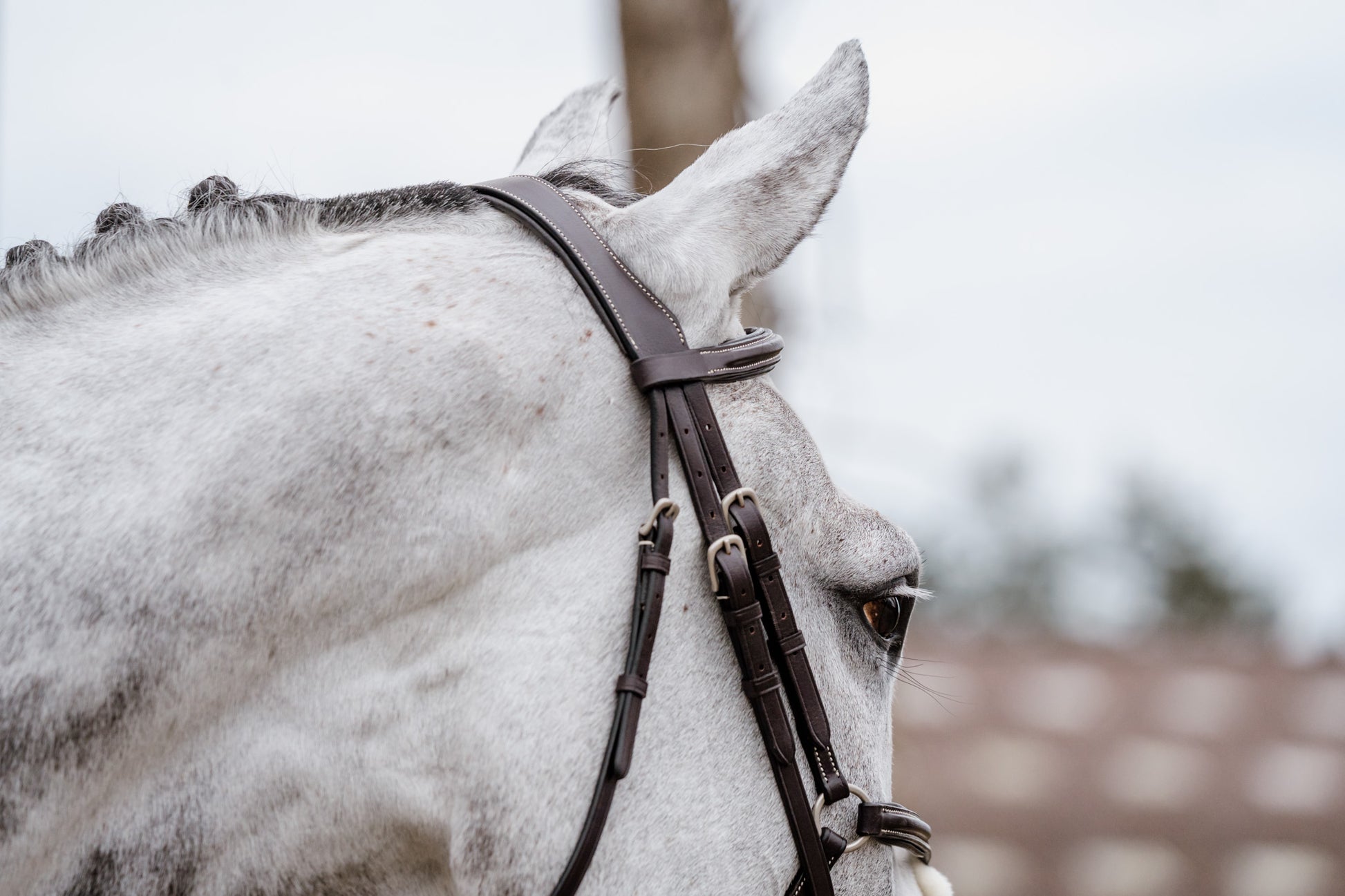 Ce bridon avec une muserolle mexicaine est fabriqué en cuir de vachette ferme mais souple. Le frontal et la muserolle présentent des coutures décoratives de couleur crème.