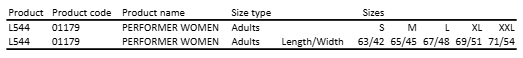 Tableau des tailles