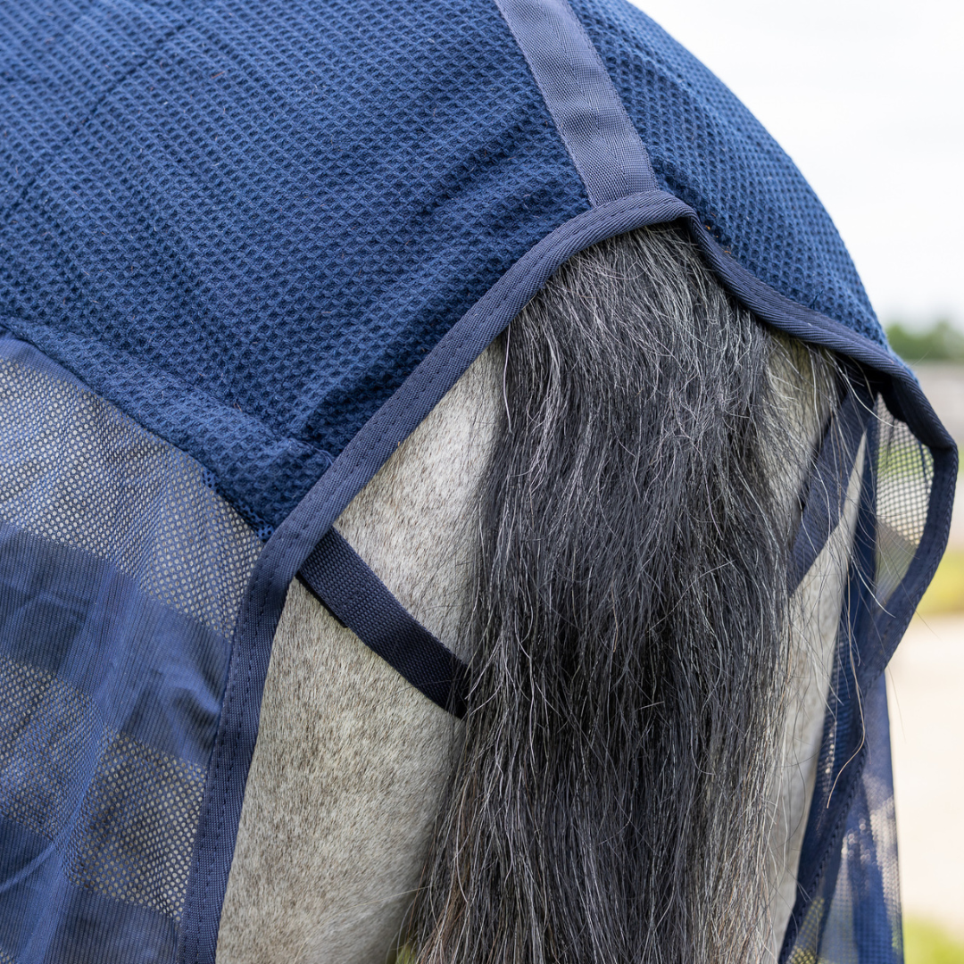 Honeycomb is een licht katoenen stof die perfect kan worden gebruikt om zweet in de zomer op te nemen. De honingraatcellen helpen lucht vast te houden, wat bijdraagt aan het reguleren van de lichaamstemperatuur en het warm houden zonder oververhitting. Bovendien draagt het honeycomb patroon bij aan de algehele zachtheid en duurzaamheid van de deken. In combinatie met een anti-vliegdeken beschermt dit je paard tegen insecten en de koelere zomerwinden.