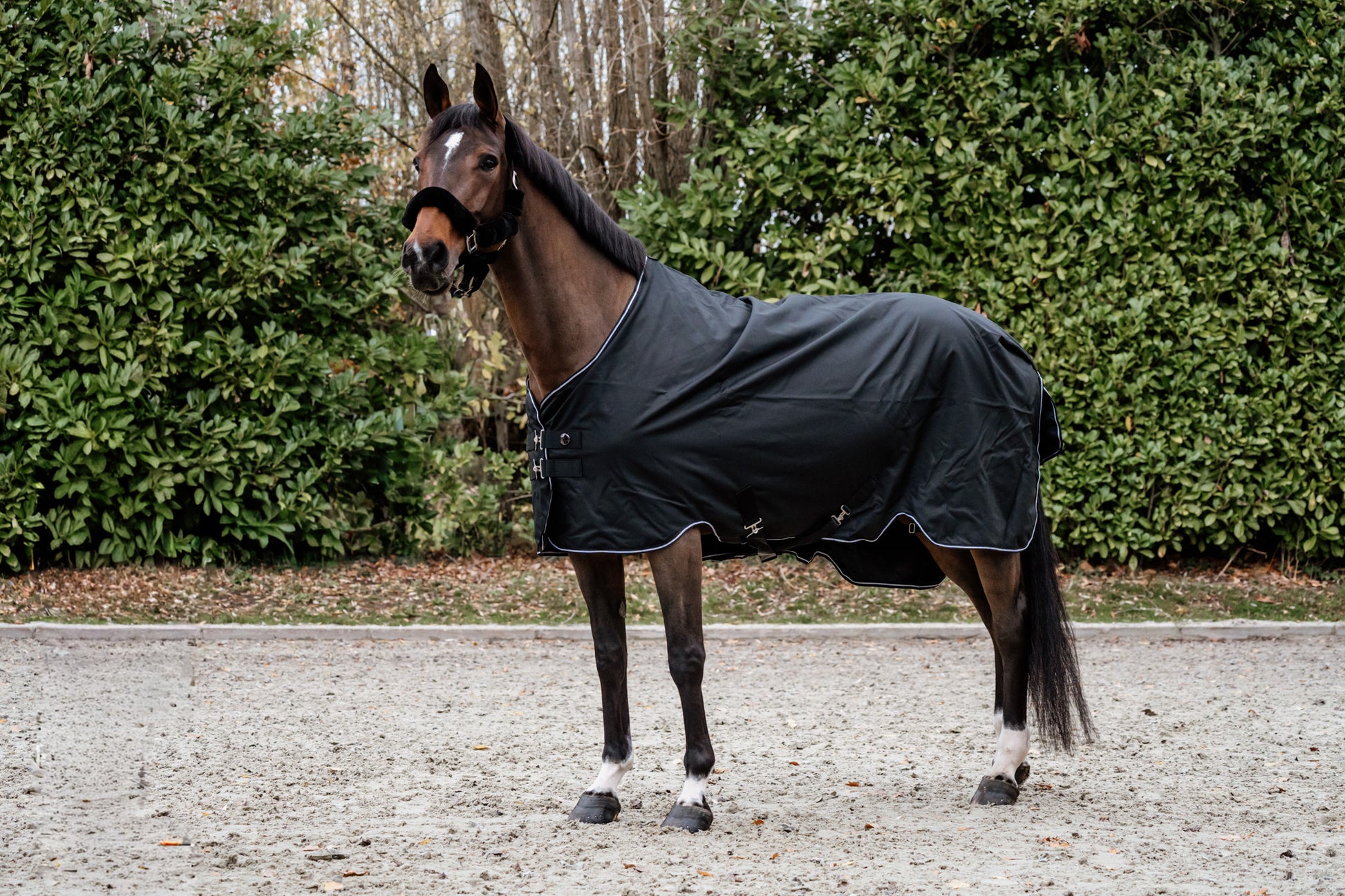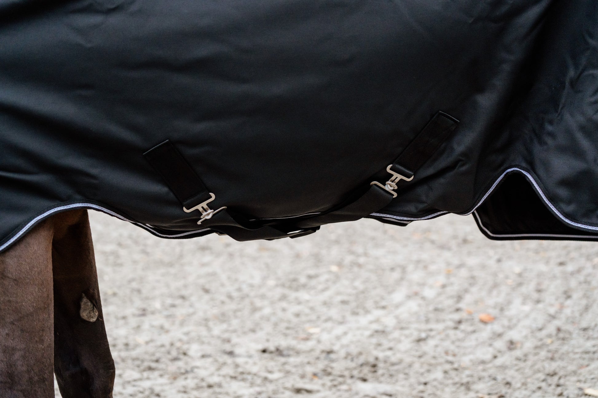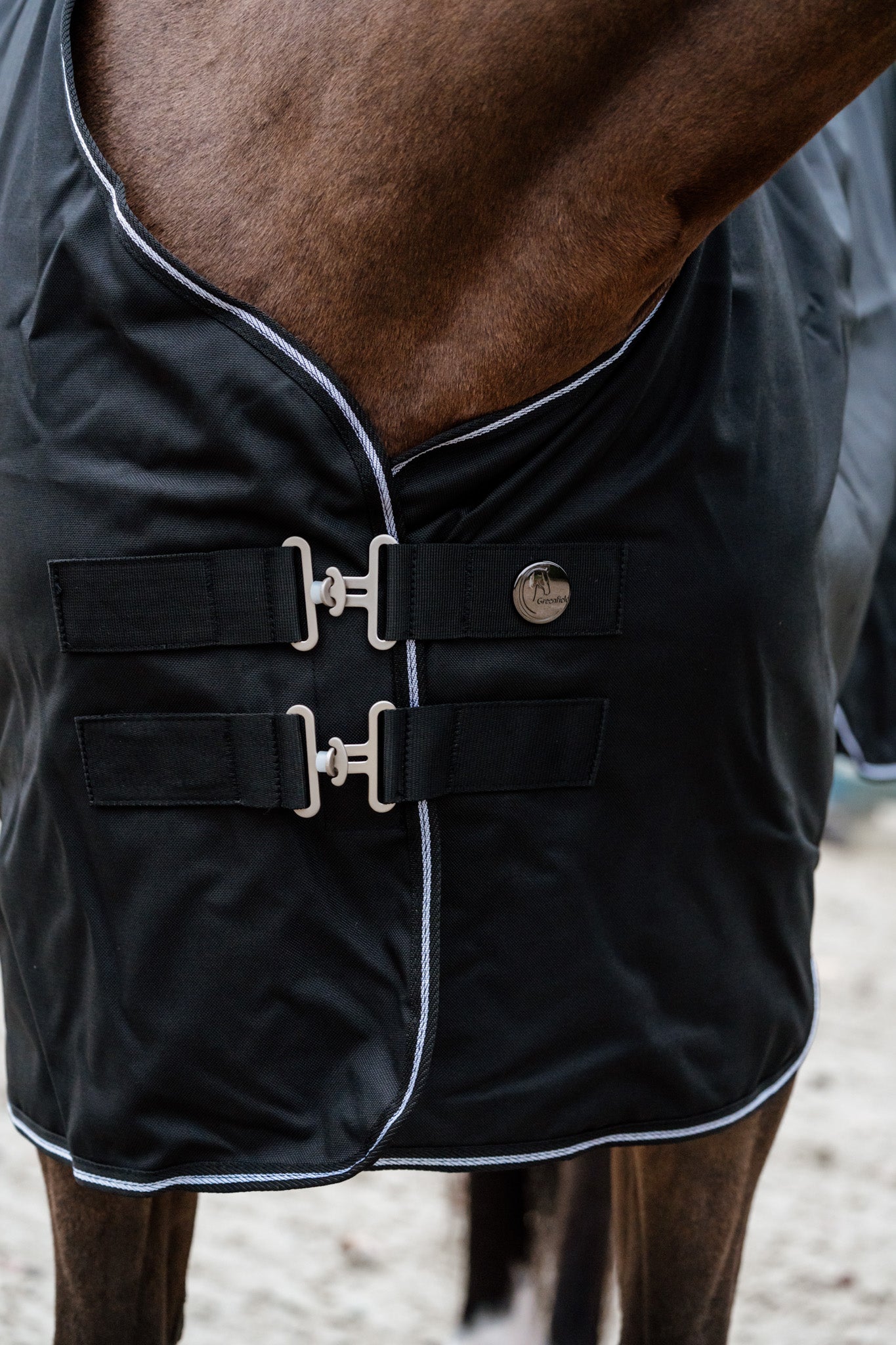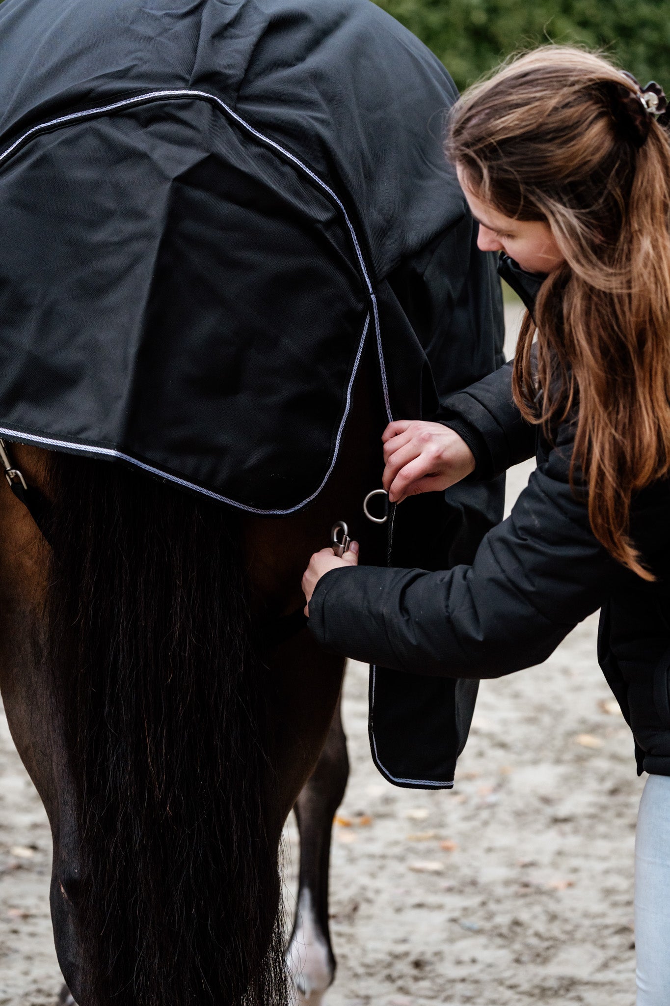 Voor een veilige en nauwsluitende pasvorm is de regendeken uitgerust met vaste buiksingels met T-gespen en twee T-gespen op de borst. Het afneembare, wasbare staartkoord maakt het onderhoud eenvoudig en hygiënisch. Daarnaast is de deken voorzien van een bevestiging voor een onderdeken en een afneembare halsbeschermer, zodat je gemakkelijk extra warmte kunt toevoegen wanneer dat nodig is.